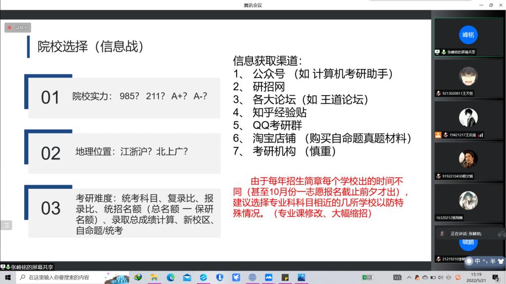 讲座开始,赵中豪首先从保研经历出发,同时结合自身大学阶段的发展规划,向同学们介绍了保研的相关知识以及明确保研道路所带来的优势。同样是从分享保研经历开始,房梓晔则列举了许多关于保研的常见问题,并对其一一做出了详细的解答,同时她还热情地回答了同学们提出的关于自身发展的疑惑。紧接着,孙梦分享了自己在考研和求职两阶段的心得体会,她还特别强调调整自身状态对考研的重要性。为了让同学们对考研的奋斗过程有更加深刻的了解,张峰铭提供了自己在各门科目的学习方法和对复习材料的选择。此外,对于各种院校的选择,他也分享了自己的独到见解。讲座在大家热烈的讨论中进入尾声。