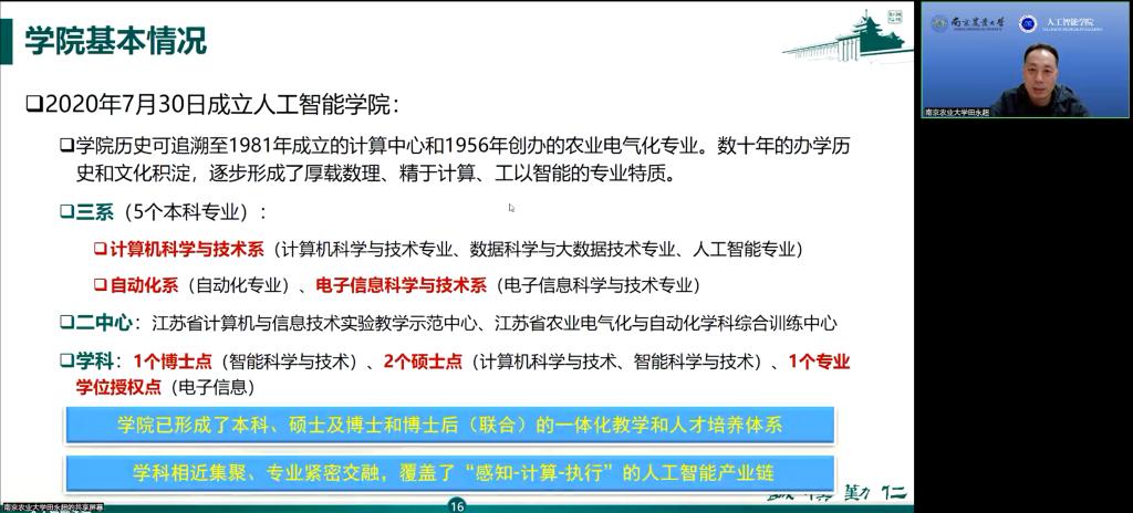 的发展历程以及各系、各专业的基本情况。他强调成人电影致力于科研创新,注重专业教学与科研相结合。在人才培养方面,成人电影拥有优秀的师资队伍,具有高级职称的教师占成人电影教师总数的70.1%,一直奉行“汇智,赋能”成人电影精神,聚力培养“通晓农业、厚载数理、精于计算、工以智能”的复合型人才。他指出,尽管成人电影