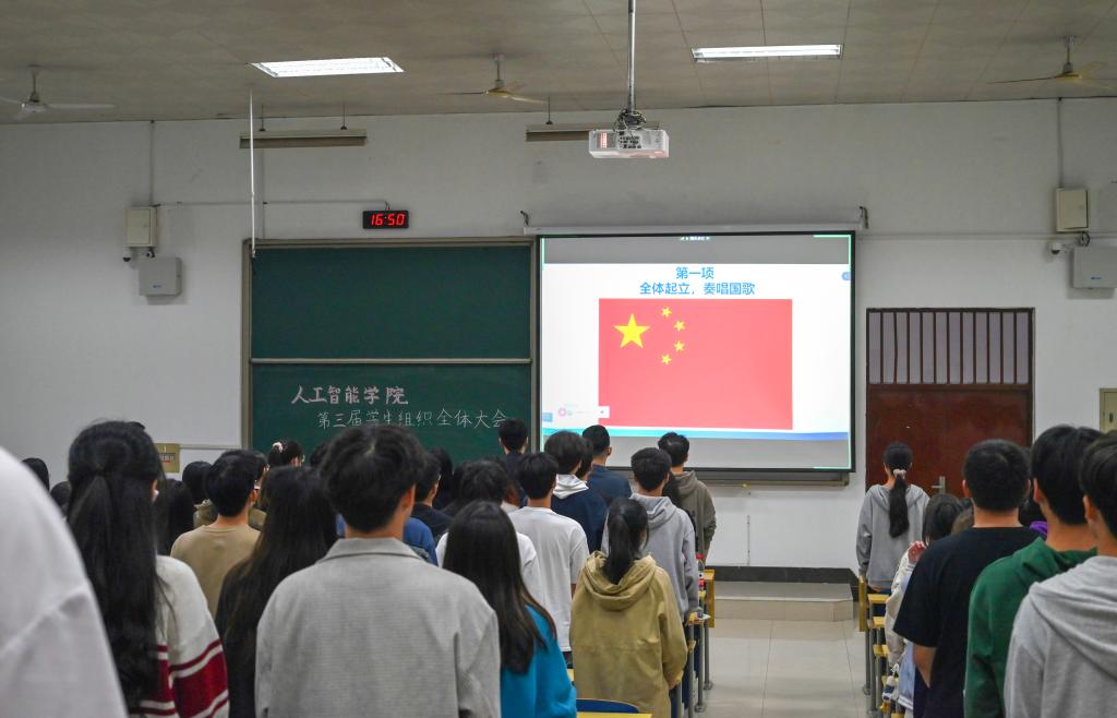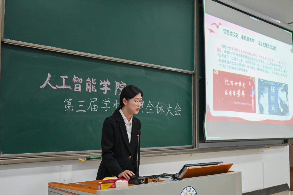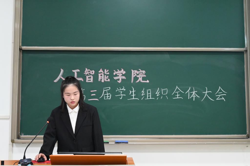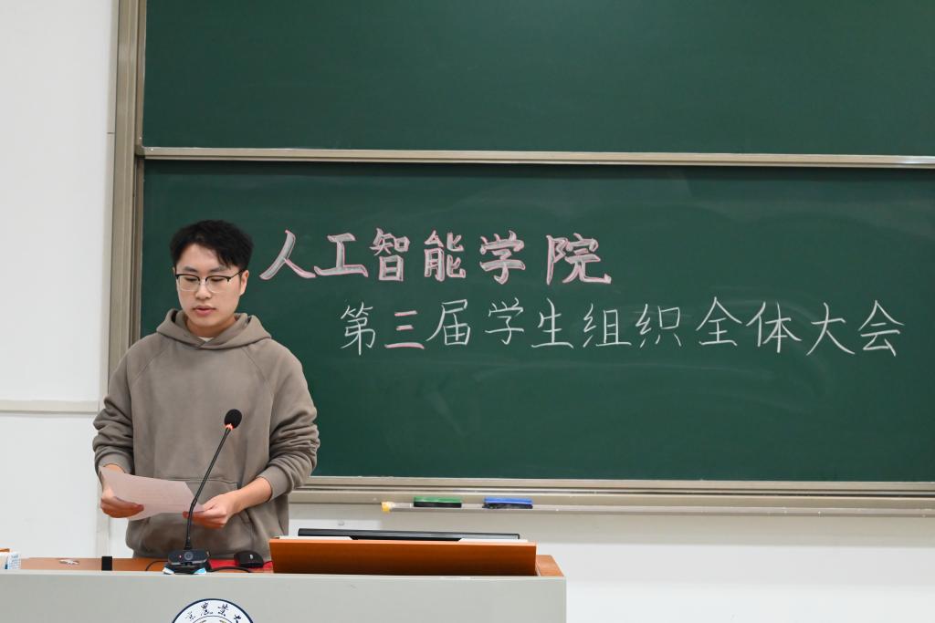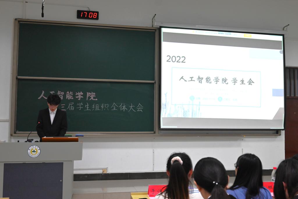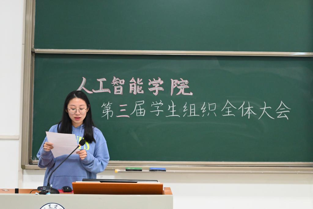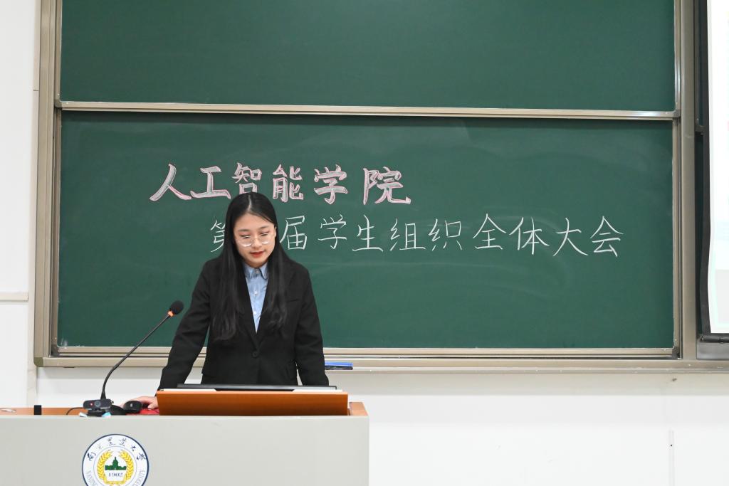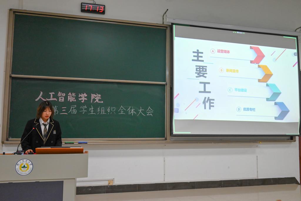 会议第二项,分党校秘书长南靖妍、学生团委副书记刘雅彬、学生会执行主席刘涛、全媒体中心主任梅秋怡、AI工坊主席王楚涵依次上台,分别介绍成人电影