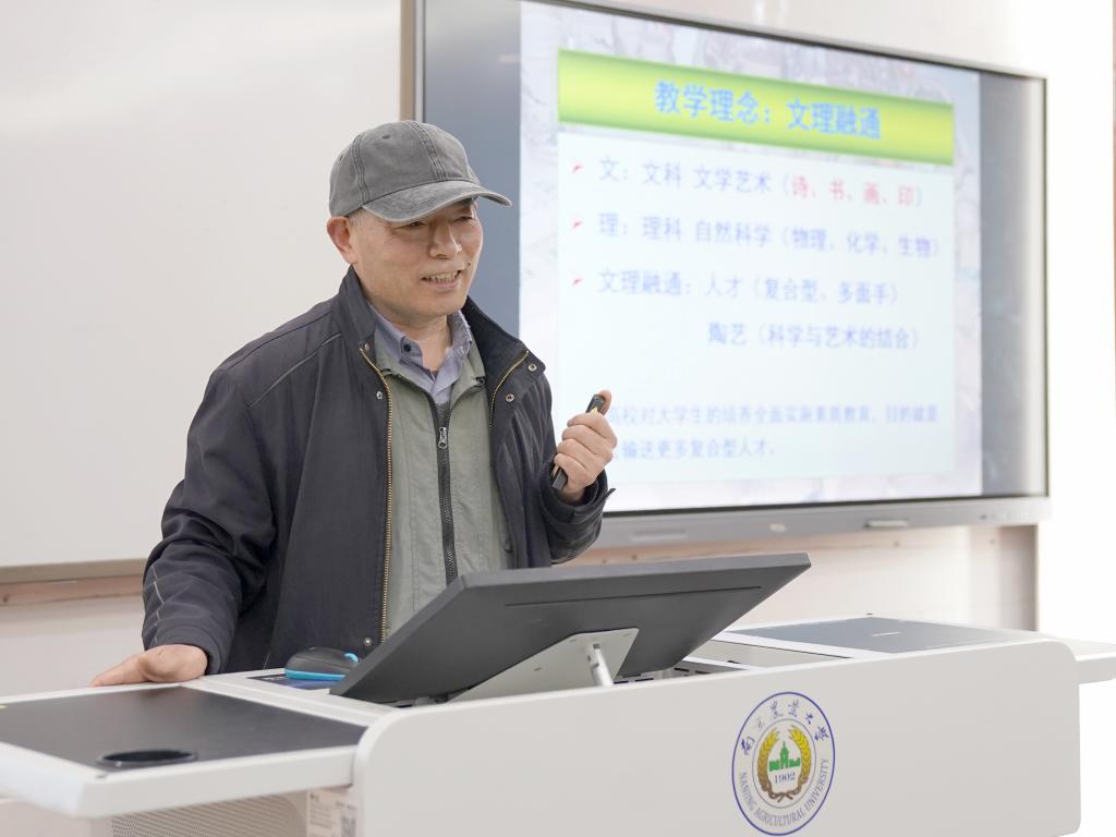 为了让同学们进一步了解宜兴紫砂的概况,宗良纲分别从泥料、造型、工艺、落款、功能和作品名称六个大方面和“一看二摸三试水”三个步骤进行一一讲解与示范,并向大家介绍陶艺成型方法,耐心地向同学们展示这些方法的核心要点和巧妙之处。宗教授指出陶艺是科学与艺术的结合,高校对大学生的培养正全面实施素质教育,故而他秉持着“文理融通”的教学理念,为智能院的同学赋能文化自信,力求输送更多高质量的复合型人才。