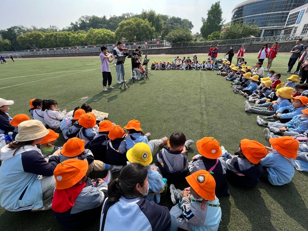 操场上,志愿者们精心准备的文艺演出赢得小朋友们的阵阵掌声。一首《孤勇者》点燃了孩子们的热情,小朋友们争相上台与哥哥姐姐们共同表演,操场上响起了大合唱的声音。随后,志愿者们还表演了话剧《我比你画》、器乐《狮子王》、舞蹈《一起向未来》,孩子们看得津津有味,切身感受到了校园艺术的魅力。