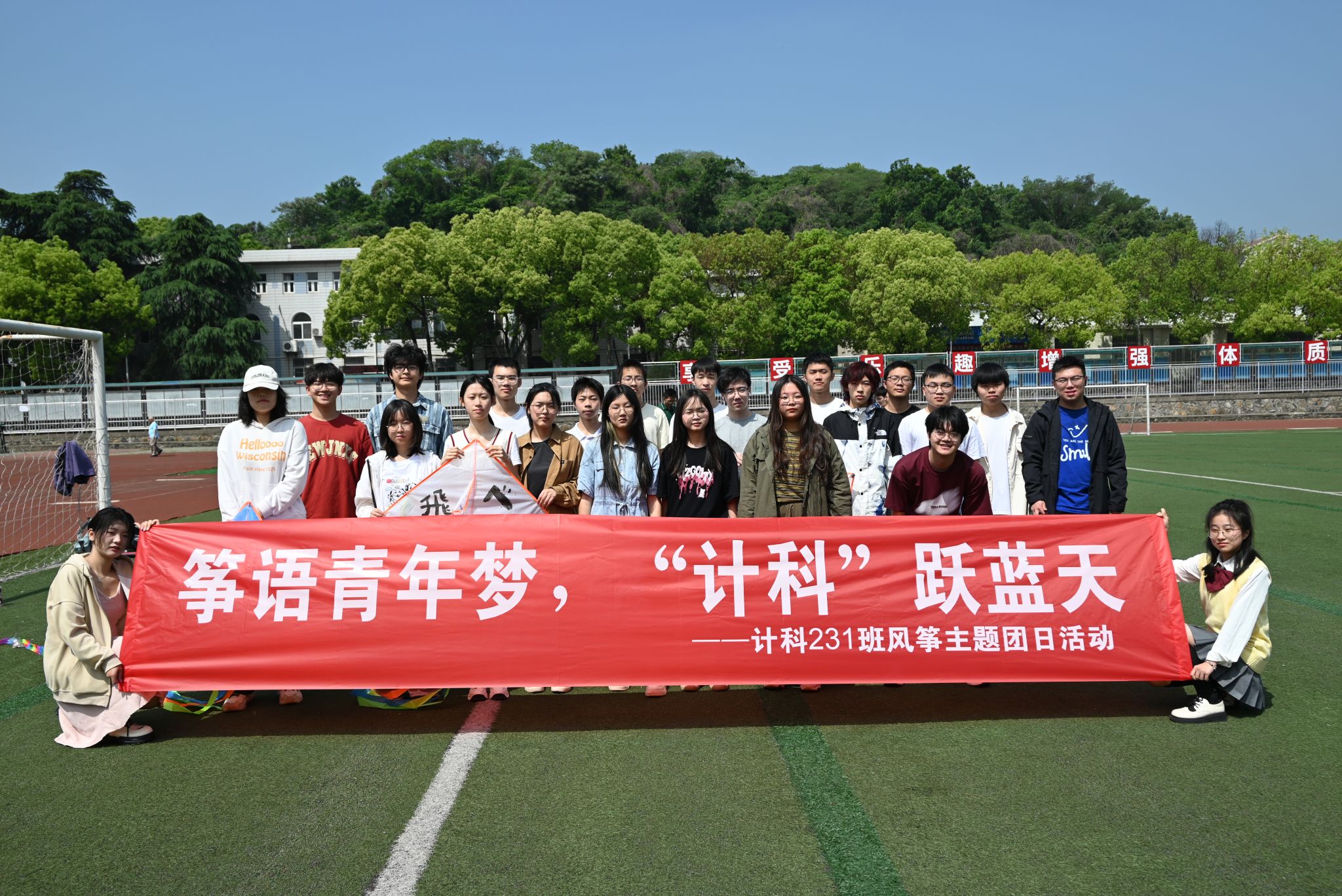 最后,计科231班支部成员于操场合影,圆满结束了本次团日活动。等风来,不如追风去,一笔一画的创造闪耀青春的光辉,跃于蓝天的赤红映照着五四精神的传承,希望同学们筑梦青春放飞理想,在最美好的青春里不负韶华、砥砺前行。