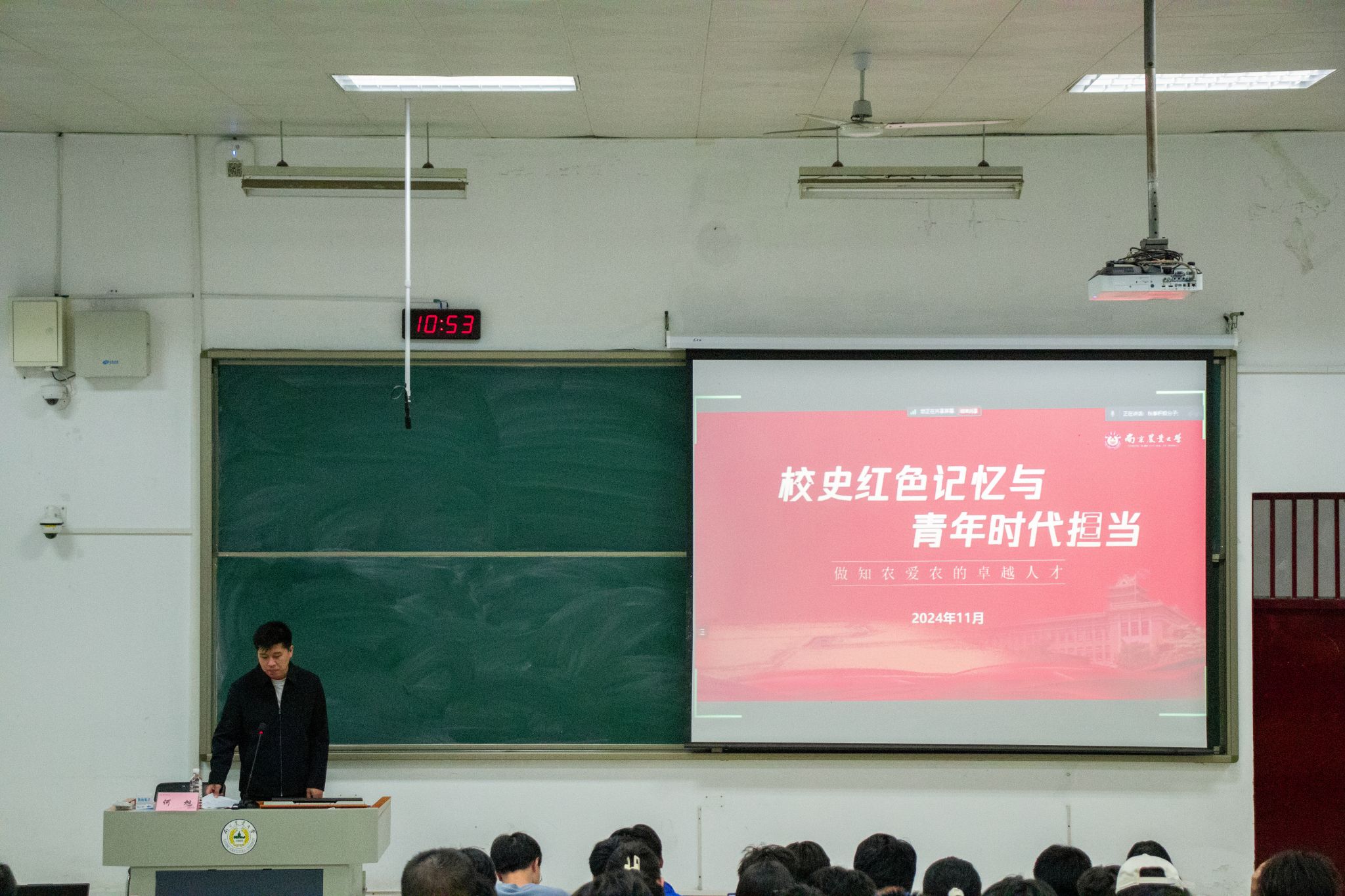 何旭以“校史红色记忆与青年时代担当”为主题,从党史联系校史的角度,结合新时代南农精神,追忆王酉亭先生、金善宝先生等南农优秀前辈的事迹,并讲述了新时代南农人的使命与担当,带领学员们感受南农深厚的历史底蕴、丰硕的实践成果和奋发的进取精神,激励在场青年学子勇于拼搏创新,争做时代新人。