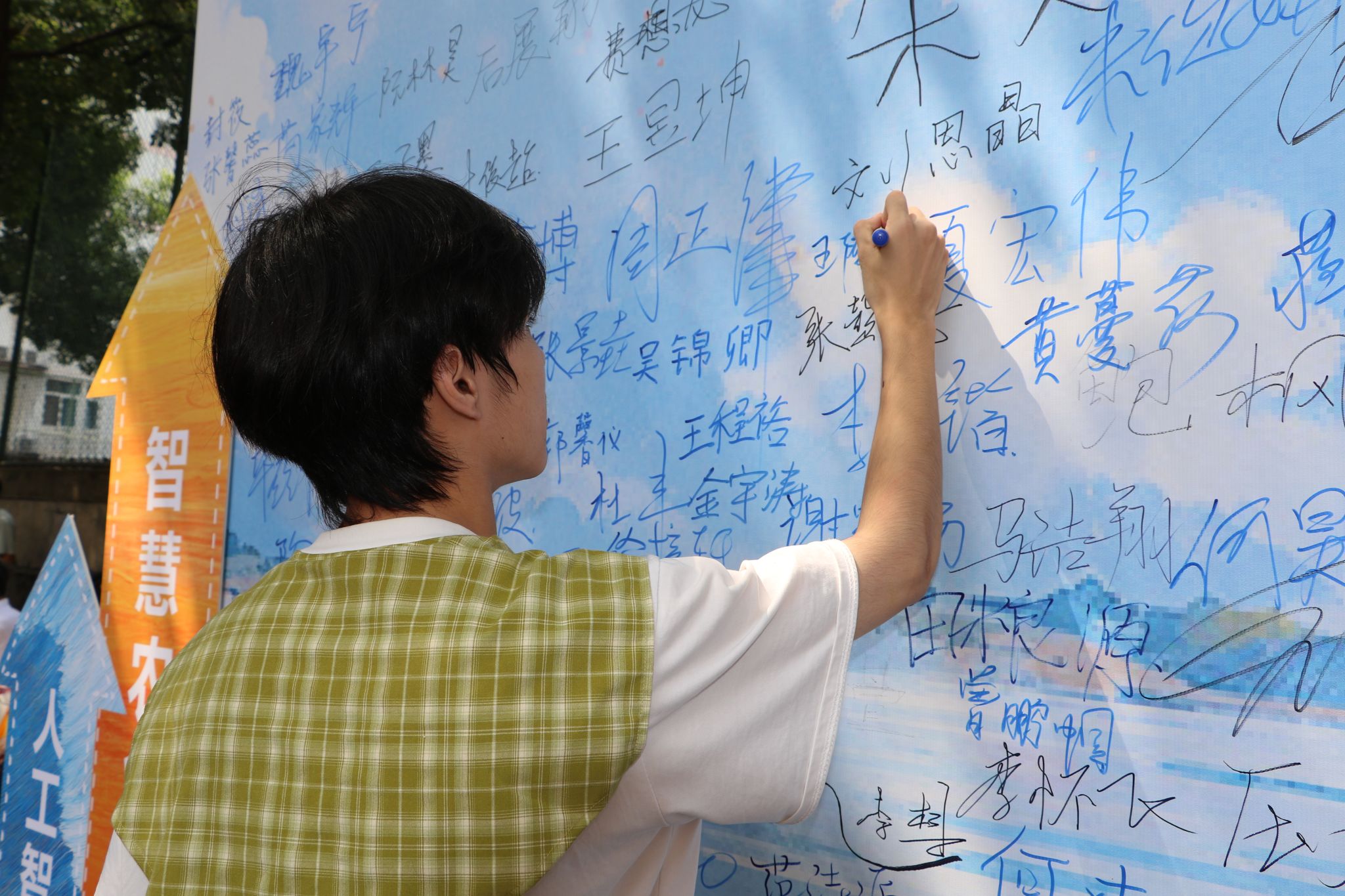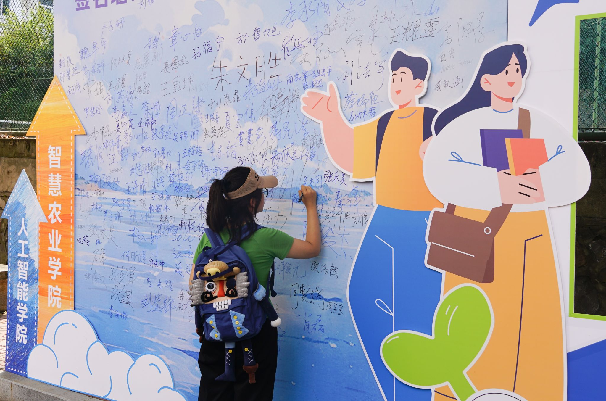 成人电影特别打造的主题签名墙成为迎新现场的视觉焦点——以蓝色为主色调的背景板上,“智慧农业成人电影(成人电影